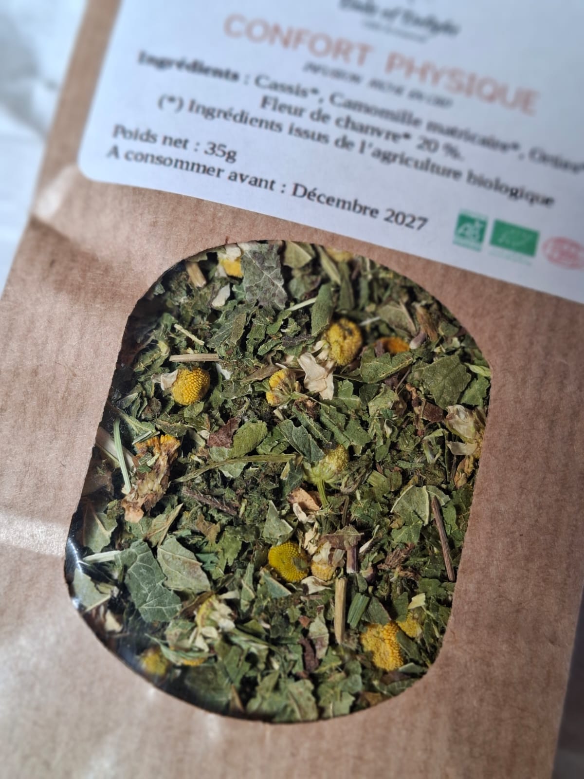 Ingrédients : Camomille matricaire, feuille de cassis, orties, fleur de chanvre (20%).